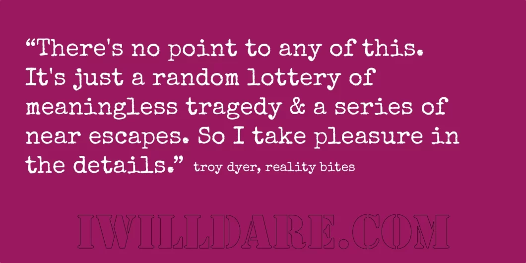 Hi Darling Ones, From the very first time I saw “Reality Bites” at an Eau Claire movie theater with my pal Amy in 1994 I’ve been a Lelaina. Of course I wanted to be a Vicky. Who didn’t? She was a sarcastic, droll, vintage, fuck & run kinda girl. She did not care about letters or sodas. I still kinda want to be Vicky. Instead, I was an earnest, eager, “I was gonna be someone by the time I was…
